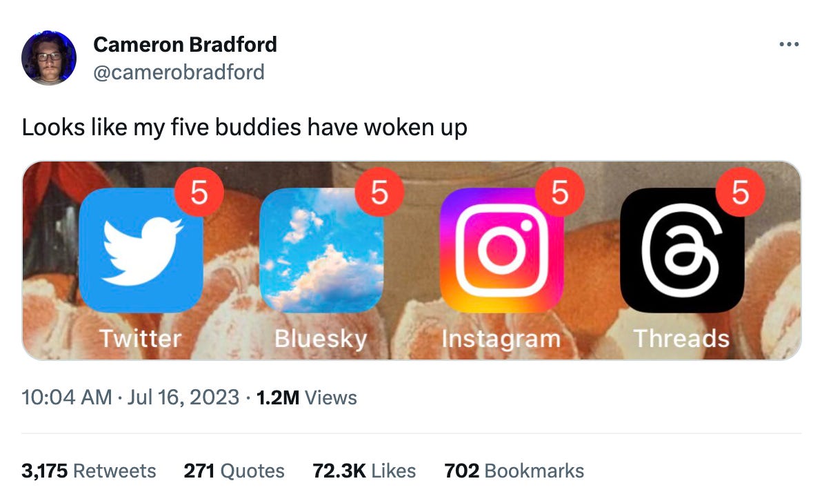 On July 5, Meta released Threads into the world. Its arrival came after months of anticipation, but ultimately a bit earlier than Meta had planned. Elon Musk’s characteristically self-defeating move to limit free users to viewing a small number of tweets each day had given Meta an unusually opportune moment to strike, and it seized the moment.