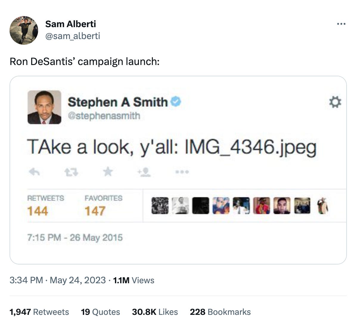 Inside the largest Slack and Discord channels of former tweeps, the mood after DeSantis’ botched announcement was nothing short of jubilant. People shared the “failure to launch” meme that circulated on Twitter, and joked about David Sacks’ grandiose claims regarding the size of the event. (Congresswoman Alexandria Ocasio-Cortez noted that “we had more people join when I played Among Us” on Twitch in 2020.)